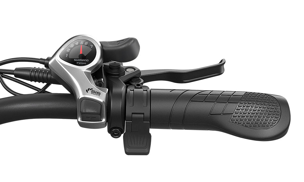 A thumbwheel throttle than a rotary throttle. Also it is equipped with Shimano 7-speed transmission, which is safer