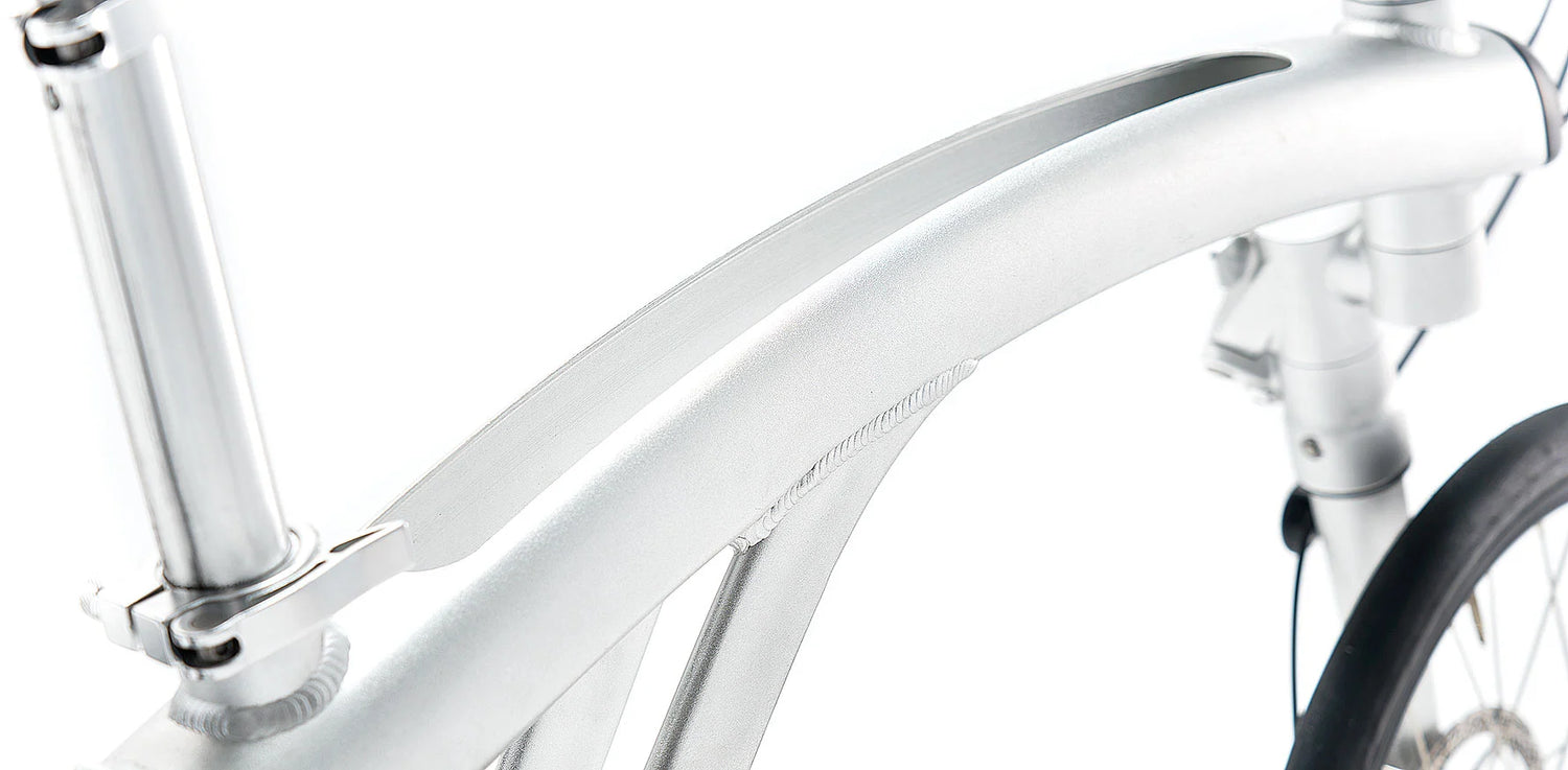 The jackknife frame. A pair of symmetrical arcs gives iruka its distinct look. The rear wheel folds into the center slit, enabling the bike to fold beautifully compact. iruka’s highly rigid structure is achieved by doing away with the hinge on the top tube – the backbone of a bicycle – resulting in unsurpassed rideability and portability.