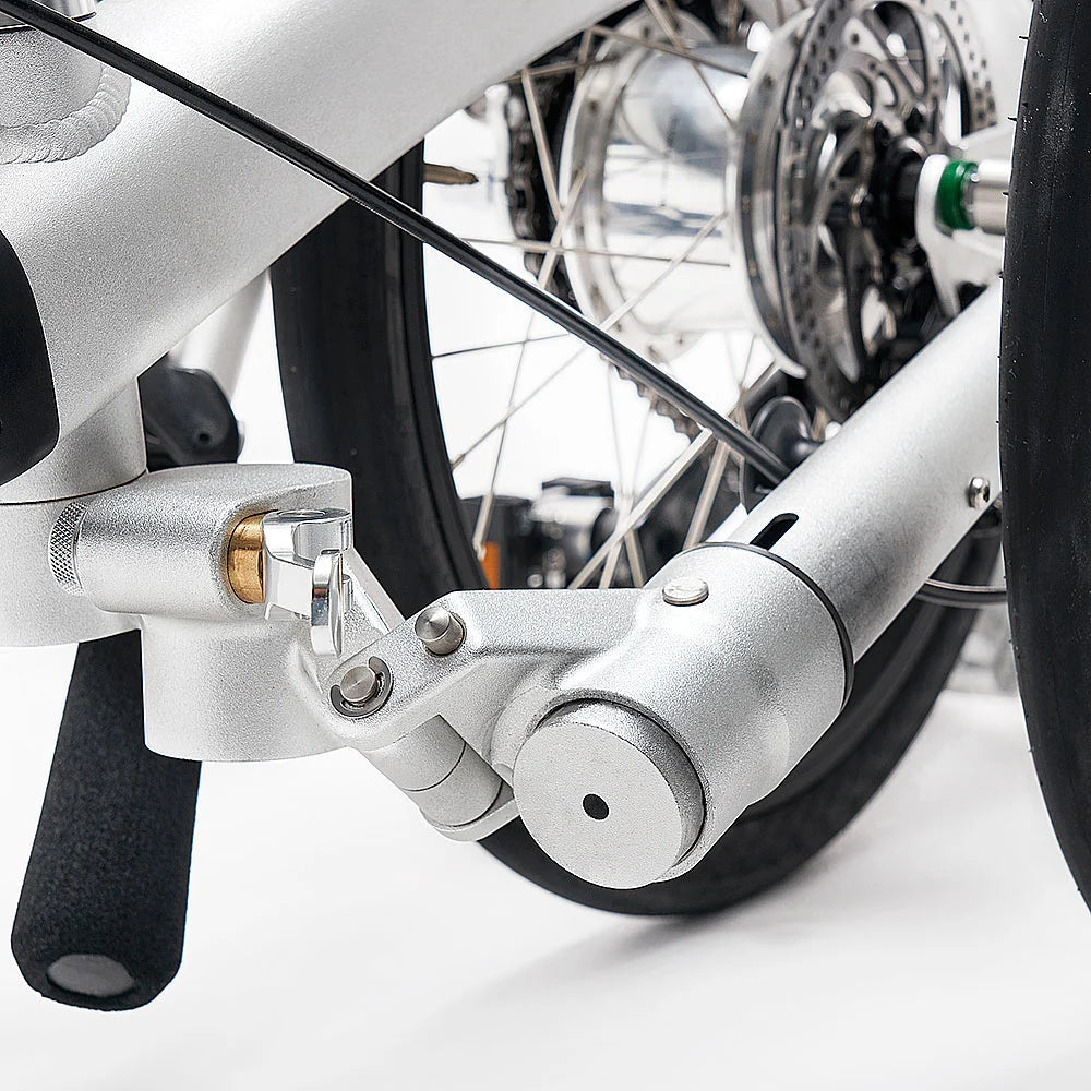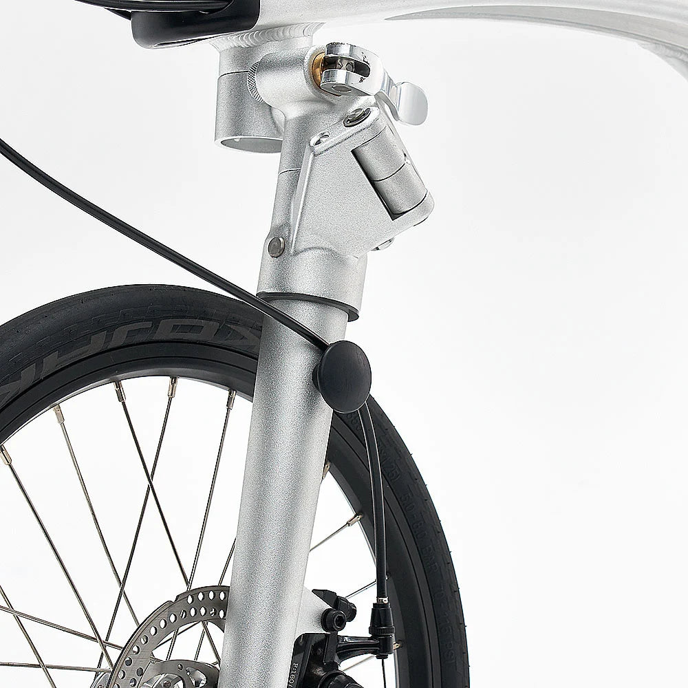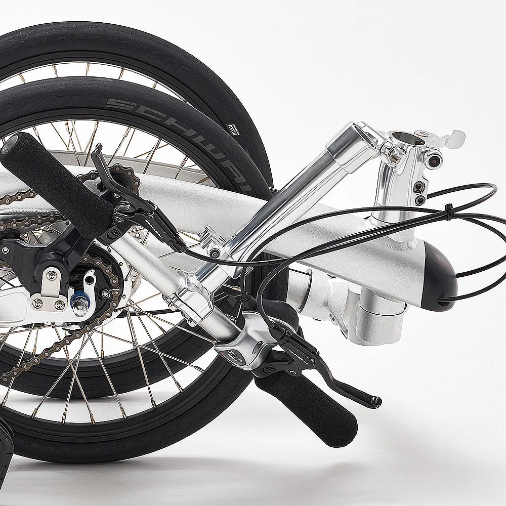 With our newly developed telescopic folding mechanism, we boldly designed the front fork with only a single cantilevered bar supporting the wheel from the left. The front and rear wheels can fold parallel and coaxial to one another, allowing the bike to be easily rolled while in the folded position.