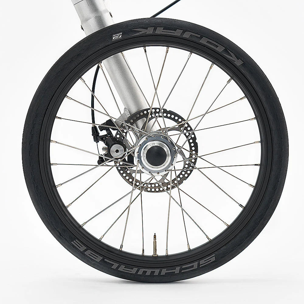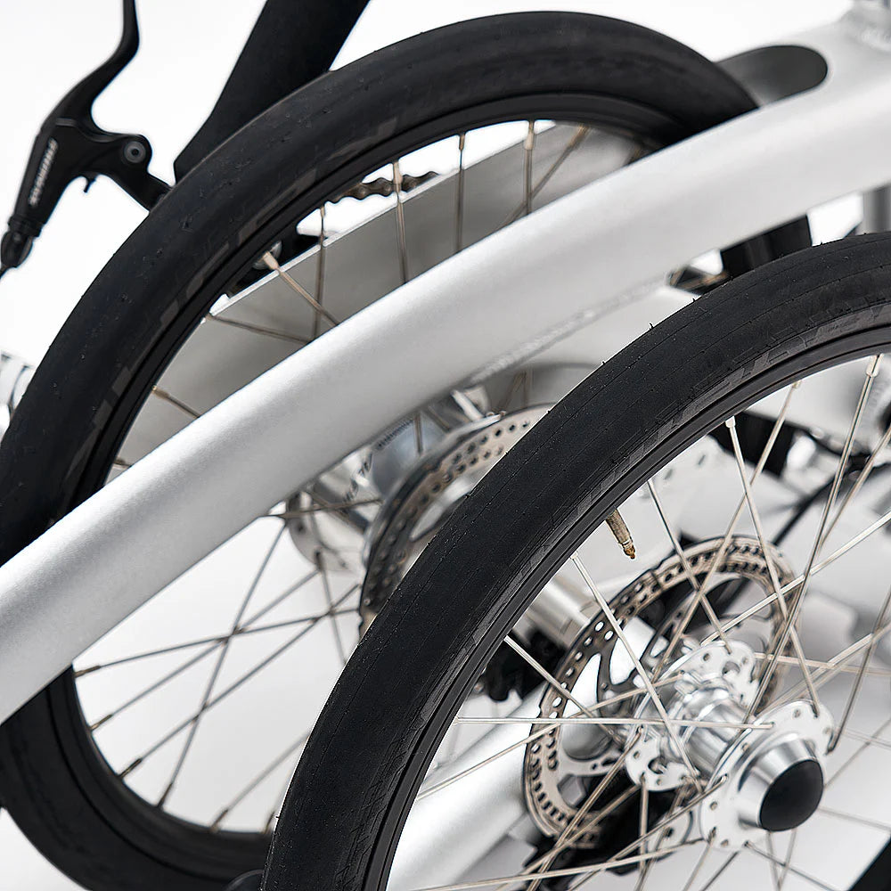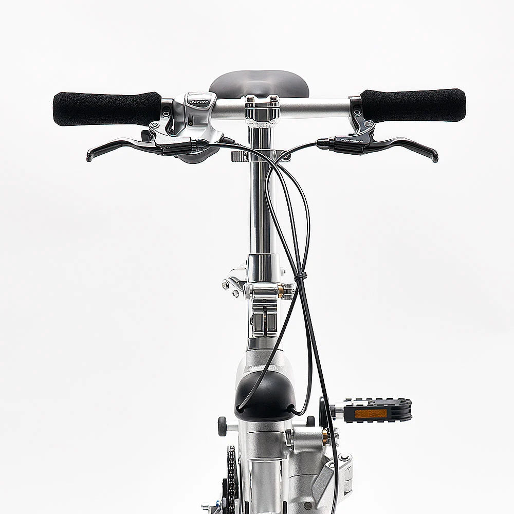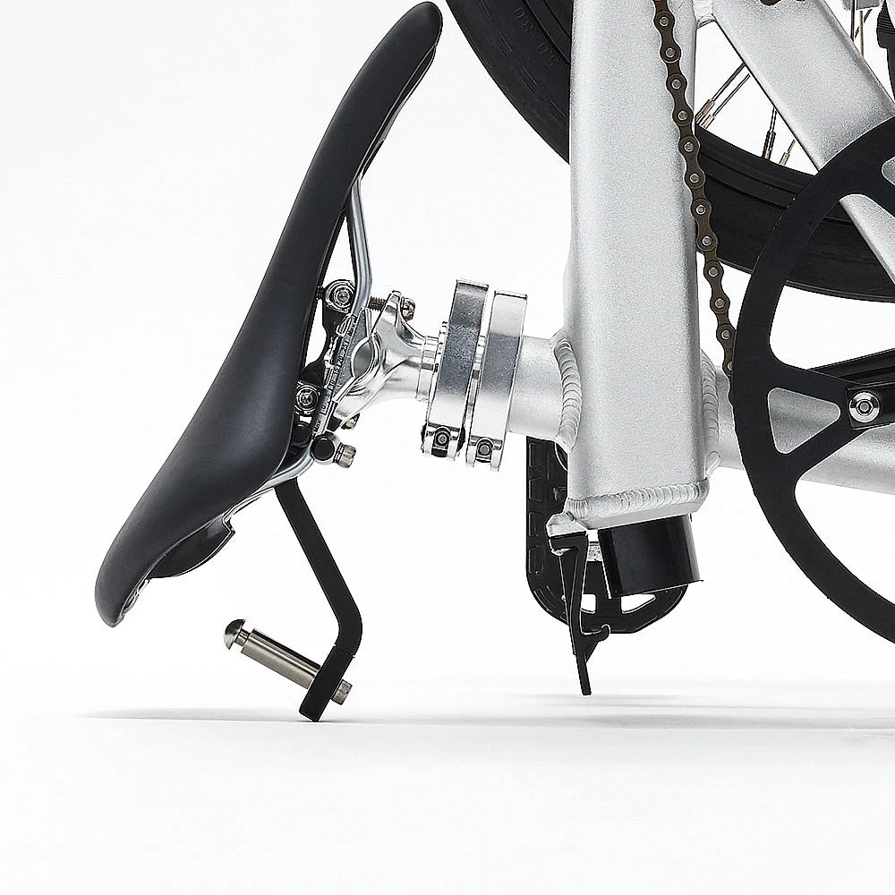 With our newly developed telescopic folding mechanism, we boldly designed the front fork with only a single cantilevered bar supporting the wheel from the left. The front and rear wheels can fold parallel and coaxial to one another, allowing the bike to be easily rolled while in the folded position.
