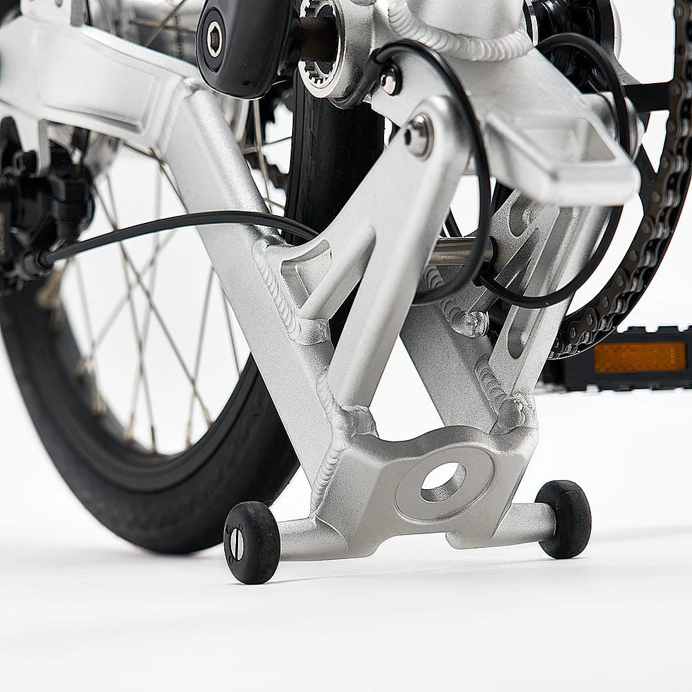 With the rear wheel folded, the bike stands on its own, resting on the front end of the rear frame. The elastomer suspension is mounted at the joint of the main frame, absorbing subtle vibrations while on the road.