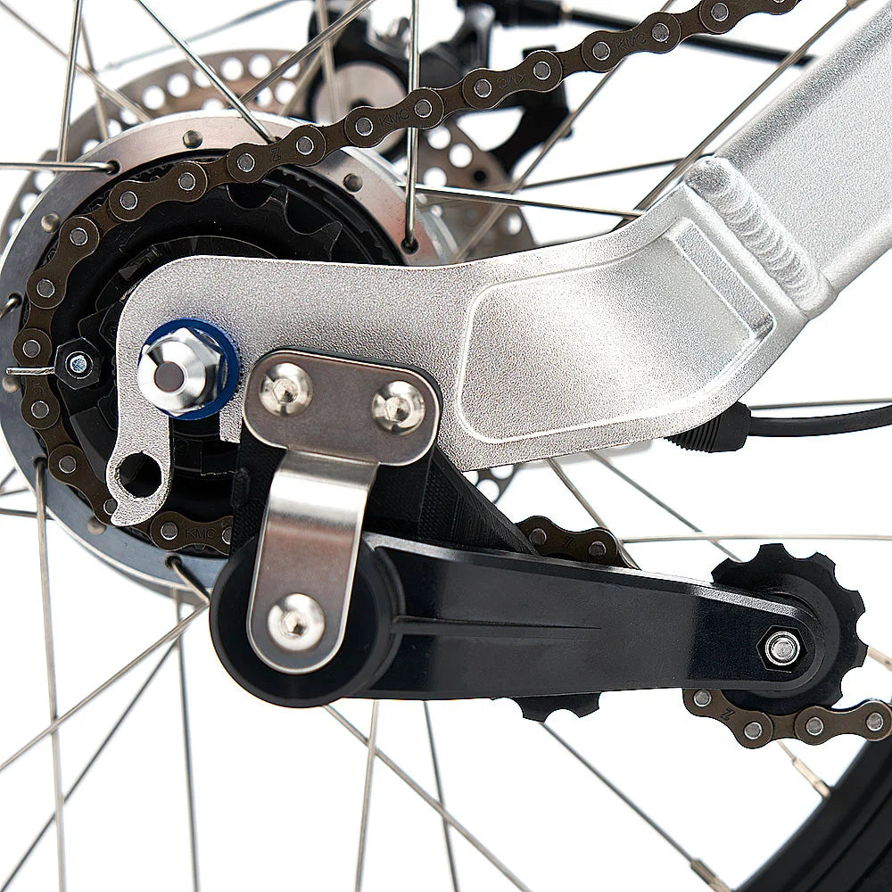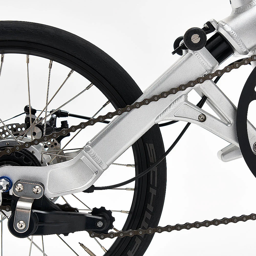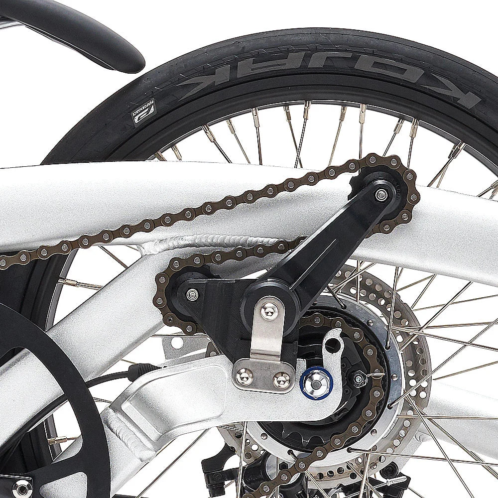 It maintains optimal tension during riding and takes up the slack to prevent chain slippage when folding the bike.