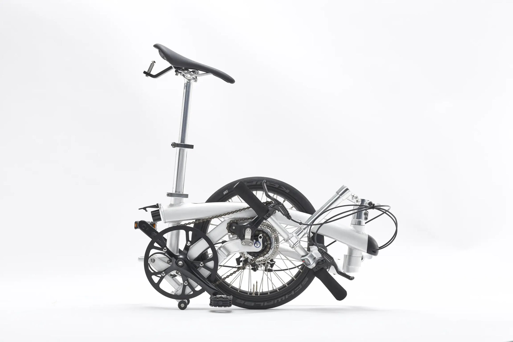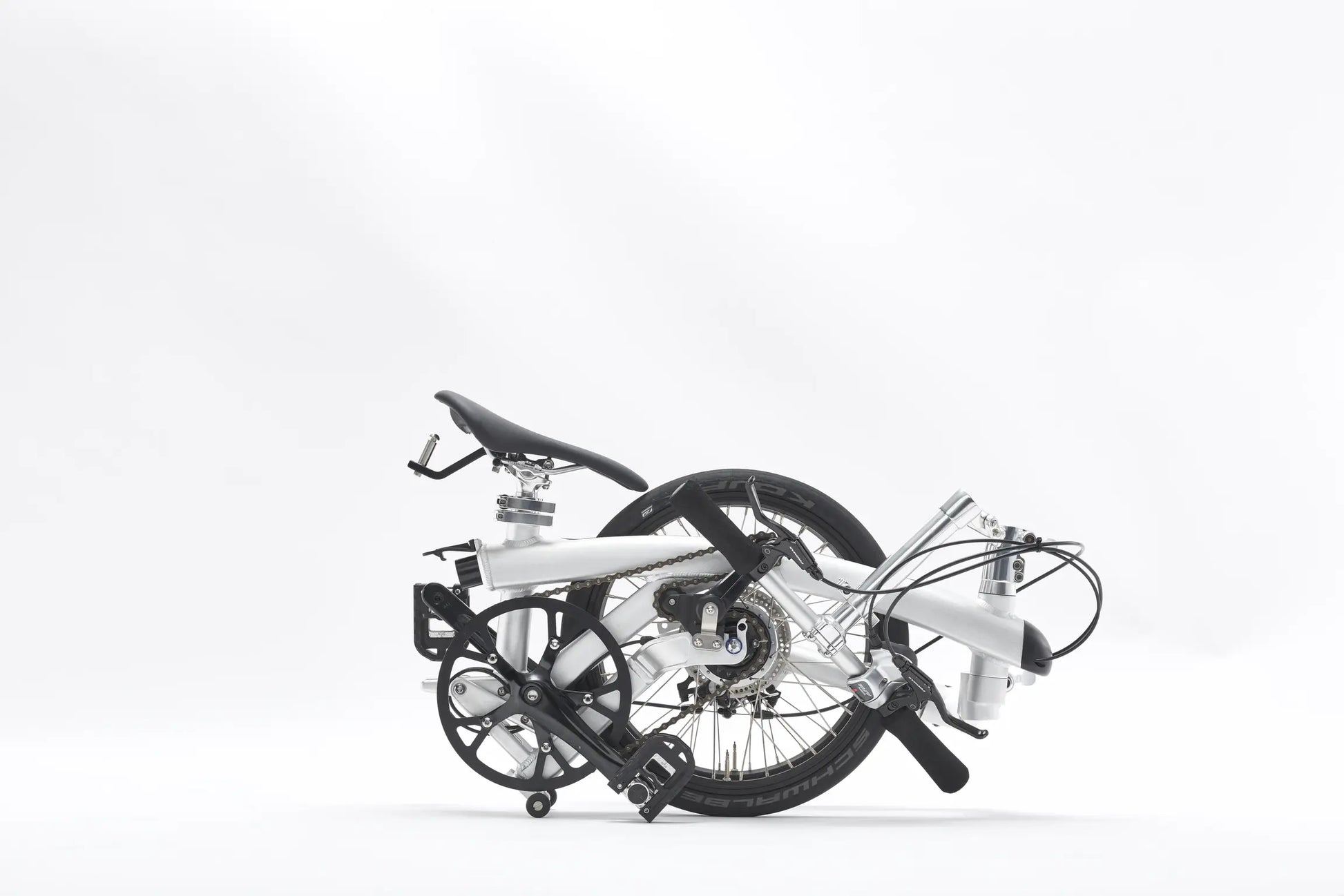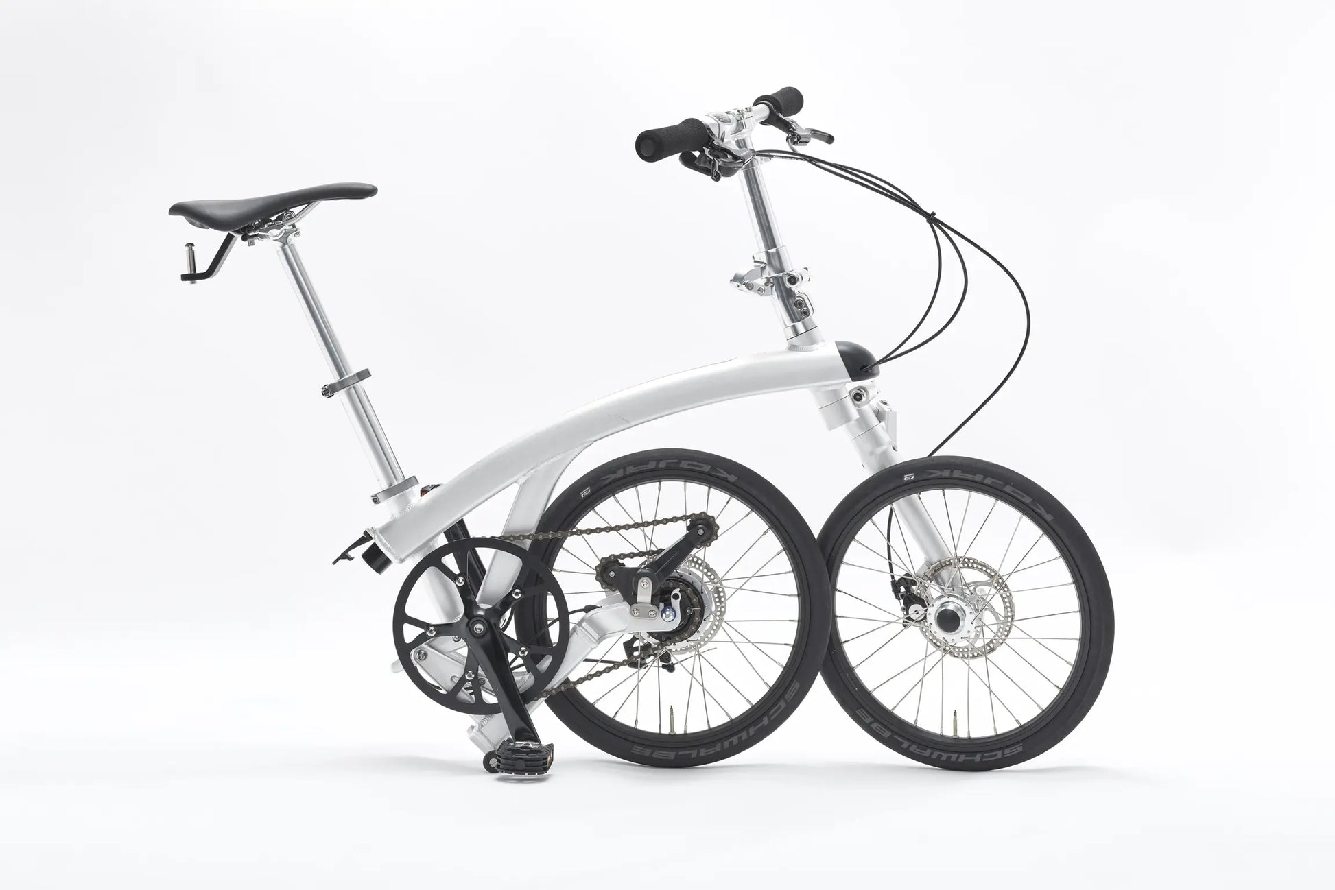 With our newly developed telescopic folding mechanism, we boldly designed the front fork with only a single cantilevered bar supporting the wheel from the left. The front and rear wheels can fold parallel and coaxial to one another, allowing the bike to be easily rolled while in the folded position.